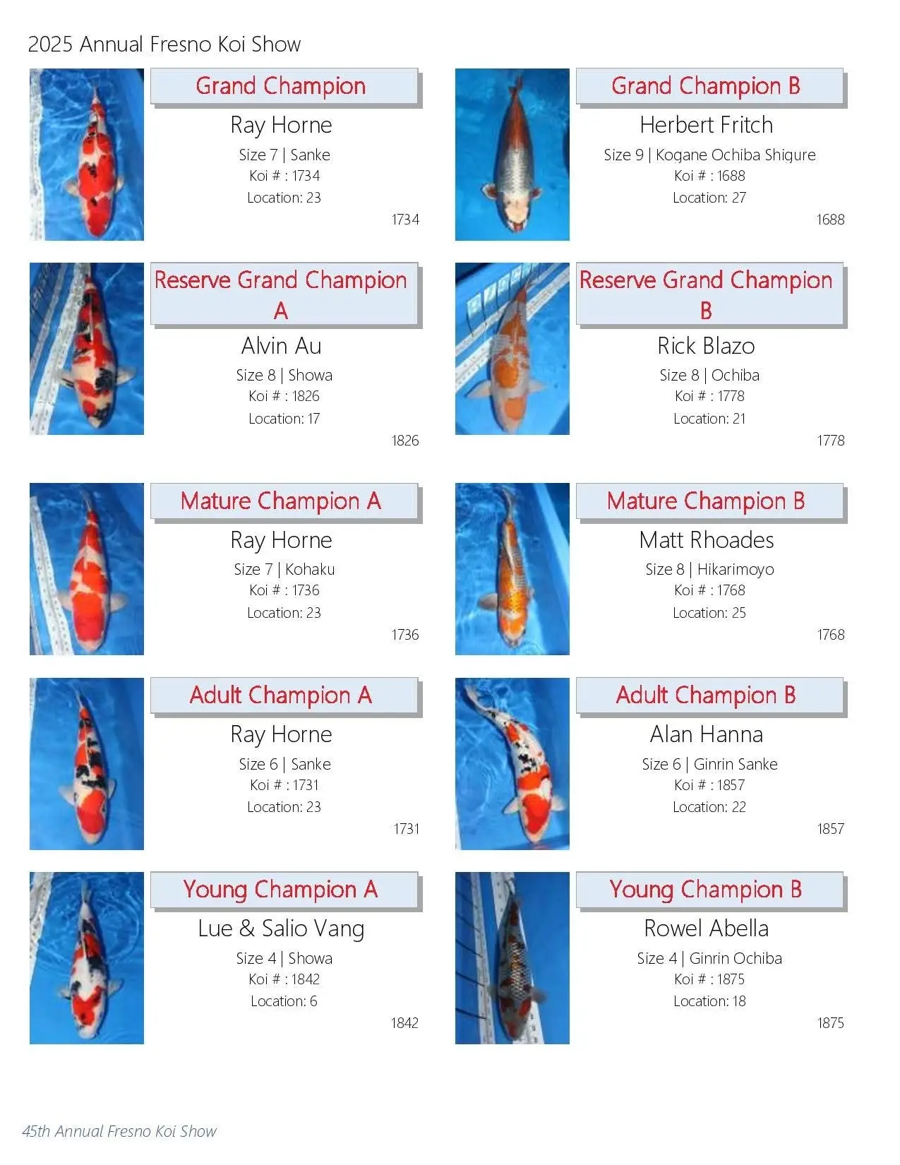 View the 2025 Fresno Koi Show Program to learn all about one of the longest-standing koi shows in the nation. Thank you to our volunteers, sponsors, vendors, and exhibitors for participating in our 45th year!